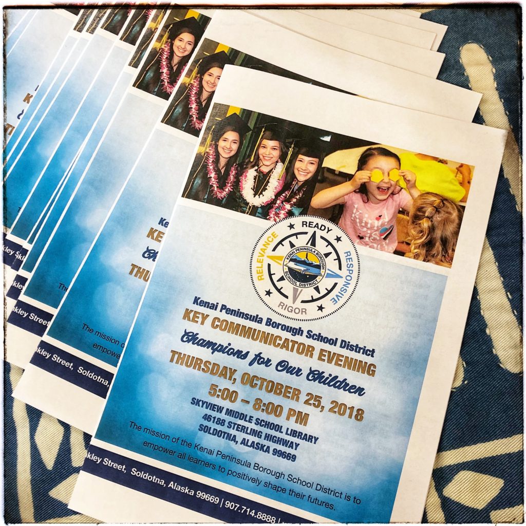 Tonight I greeted nearly 50 people who came to an event for a group I’m very involved with in the school district—Key Communicators. When the Leadership Team began planning and preparations, the title, “Champion for our Children” came to me. This afternoon, I finished the program, knowing our fantastic team works together as advocates with expertise, and we could offer an evening of excellence for a diverse group of people, from students to elected officials, about public education on the Kenai. Our young people are learning to fail forward, and live with a growth mindset, becoming world class problem solvers or solution seekers, in contrast to world class test takers. In the “Politics and Advocacy” station rotation I co-facilitated with the Superintendent, I circled around to the power of what grabs our attention, and how our personal storytelling can evoke action. We listened to each other. Ground zero to become an advocate and champion for an issue, policy change, legislation, or altering or restorative conversation starts when someone or something matters to us, and we risk stepping into, or even disrupting the gap.
